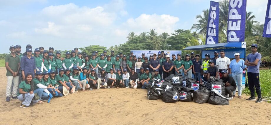 Representatives from Varun Beverages Lanka (Pvt) Ltd, Marine Environment Protection Authority (MEPA), University of Kelaniya students, and volunteers pose together during the inauguration and beach clean-up campaign at the Kalutara New Born Coast, marking the launch of the coastal adoption initiative.